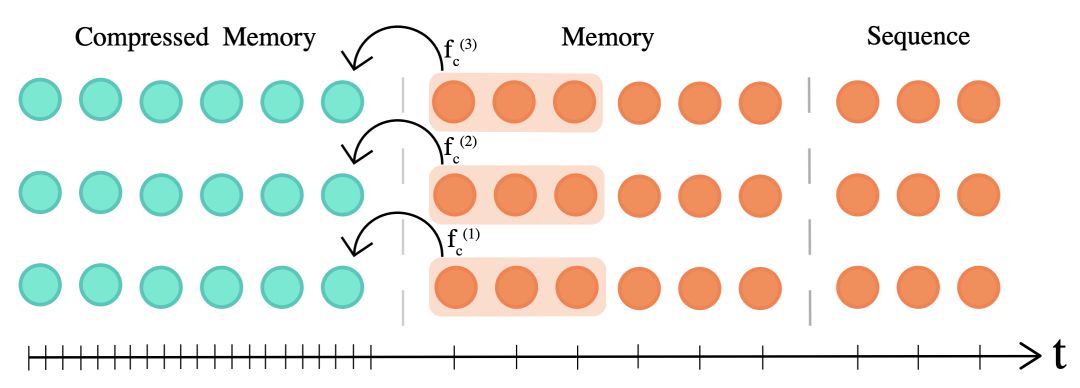 压缩的Transformer将(细粒度内存的)过去的激活压缩为一个更粗糙的压缩内存(Rae等人,2020)。