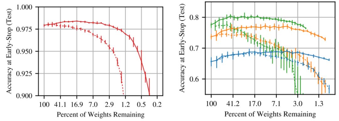 在不同的剪枝率下测试中奖彩票子网络(实线)与随机采样子网(虚线)的准确性(Frankle&Carbin,2019)。