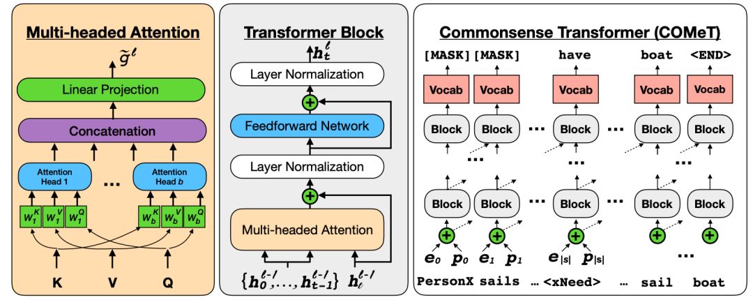 具有多头注意的标准Transformer。经过训练的模型可以根据给定的主题和关系来预测知识库三元组的对象(Bosselut等人,2019)。