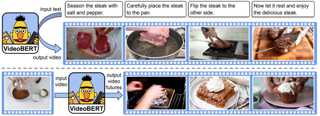 VideoBERT(Sun等人,2019年),一种最新的BERT多模态变体,根据配方(上面)生成视频“令牌”,并根据视频令牌(下面)预测不同时间尺度的未来令牌。