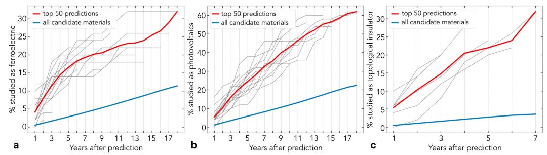 使用在不同时间段的摘要上训练得到的词嵌入预测将在未来的摘要中研究哪些材料作为铁电材料(a),光伏材料(b)和拓扑绝缘体(c ),与所有候选材料相比,更有可能对前50个预测材料进行研究(Tshitoyan等人,2019)。