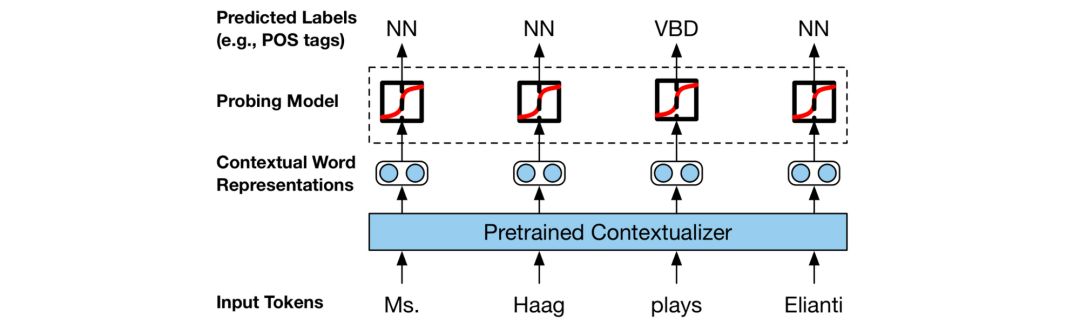 在我的印象中,过去一年首次出现很多致力于分析单个模型 BERT 的论文的现象(此类论文被称为 BERTology)。在这种情况下,旨在了解模型是否通过预测某些属性来捕获形态、语法等的探针,已成为一种常用工具(参见下图)。