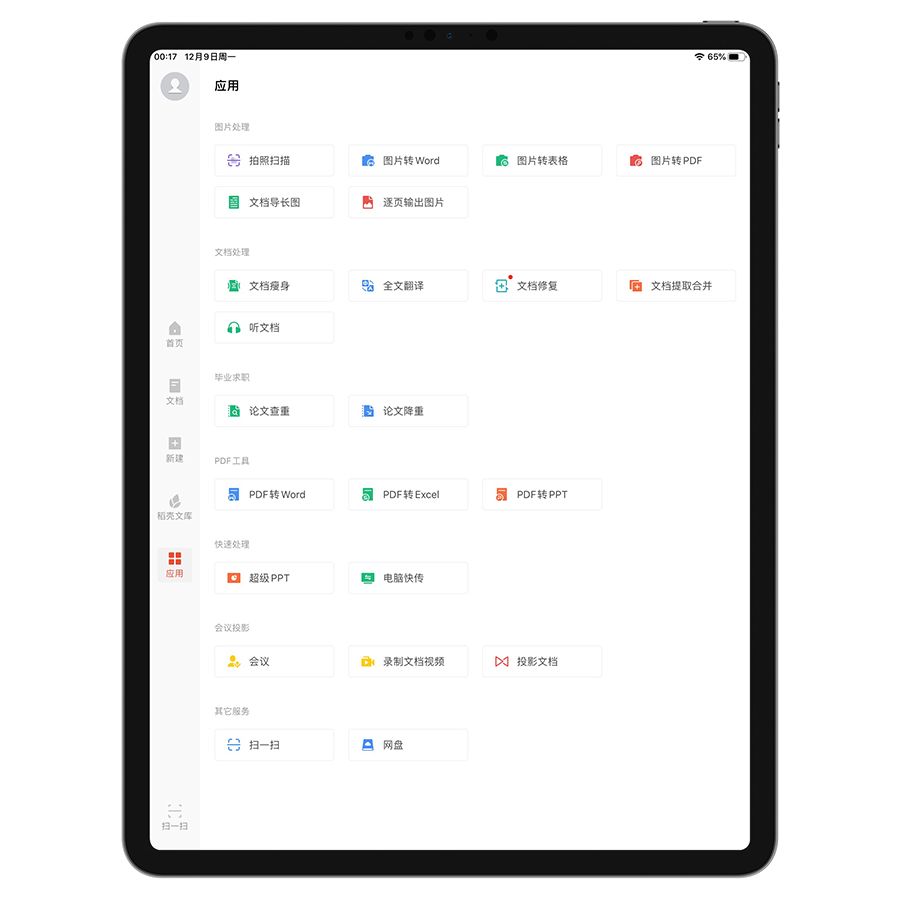 除了能够满足我们基础的文档表格 PPT 编辑功能外,它还有拍照扫描、图片转 Word、Excel、PDF 或者 PDF 转 Word、Excel、PPT 等功能,比较贴合我们的日常使用需求。