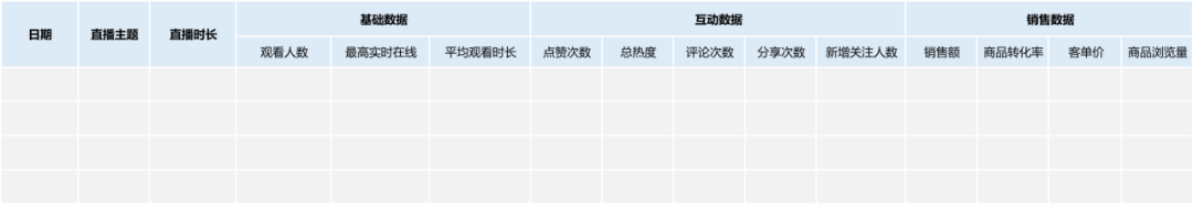 通常直播的数据包含以下:日期、直播主题、时长、观看人数、最高在线人数、平均停留时长、点赞次数、总热度、新增粉丝数、销售量、订单笔数、转化率等等。