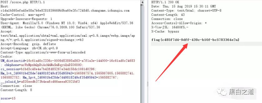 这里就是score=15的时候就会利用ajax去访问score.php。这个地方有可能是个突破点。那咱们来试一下就知道了。于是我就访问score.php并且构造了post请求。没想到就能直接得到flag一枚。