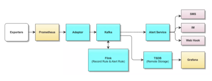 Prometheus 数据发送到 Adaptor 服务,Adaptor 服务负责将 Prometheus 发送的数据,转发到 Kafka 对应的 topic 中。Flink 流式计算服务及存储服务可以从 Kafka 中订阅所需的数据。