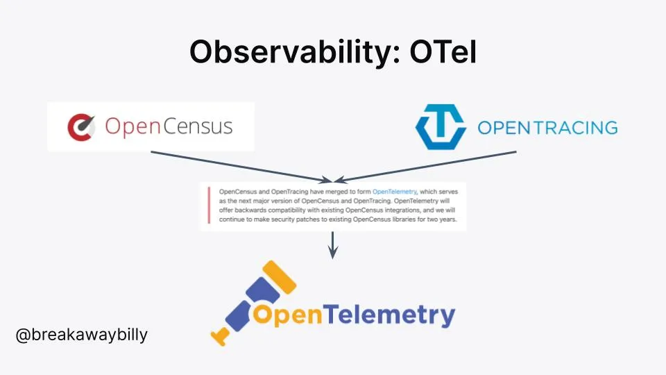 可观察性(有助于彻底地理解“分布式”系统)是一个热门领域,因为它可以帮助定位并解决生产环境 Bug,使你不会再被凌晨 3 点的警报惊醒。几年前对于可观察性如何实现,人们有许多不同的想法,其中包括 OpenCensus 和 OpenTracing。将这两个项目的创意和功能合二为一就形成了 OpenTelemetry,这是现在云原生领域发展最快的项目之一。这两个项目没有在标准化方面展开竞争,而是融合到了一个项目里,这为技术的发展提供了强大的推动力。这两个项目的结合,使 OpenTelemetry 社区能够汲取 OpenCensus 和 OpenTracing 项目的优秀创意,使贡献者们能够团结在一起推动项目更快地向前发展,最终为生态系统带来更好的项目。