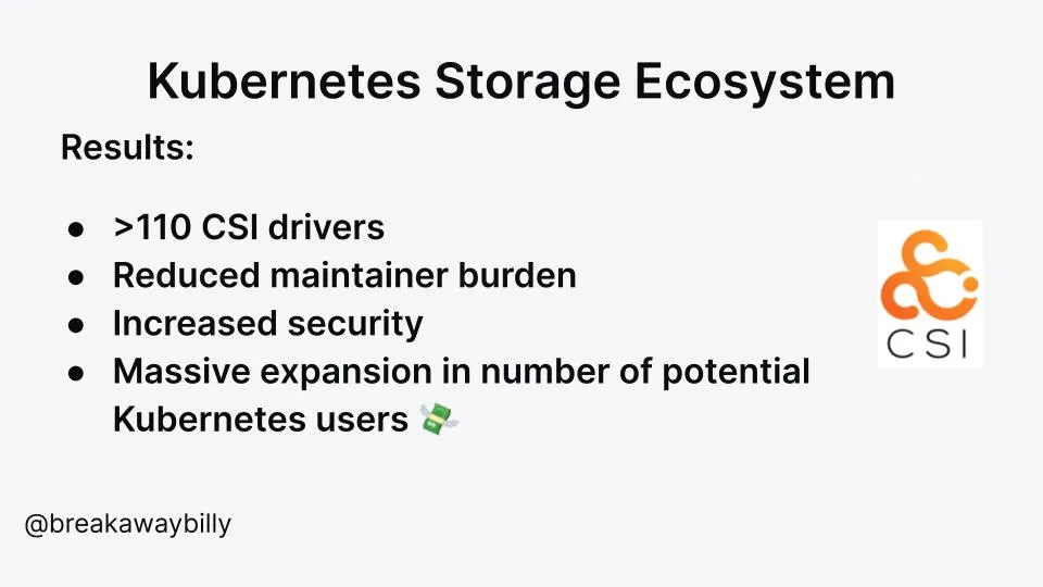 容器存储接口(CSI)是为了规范存储系统将自己暴露给容器化工作负载的方式,使存储具有可组合性。现在有超过 110 个 CSI 驱动程序供大量的供应商和存储系统选用。创建可组合的接口,既增加了可供终端用户选择的选项数量,也增加了使用 Kubernetes 的终端用户数量,为存储供应商带来了更大的潜在市场。不仅如此,它还减轻了维护者的负担,提高了 Kubernetes 核心的安全性。对于接口来说,这并不坏。
