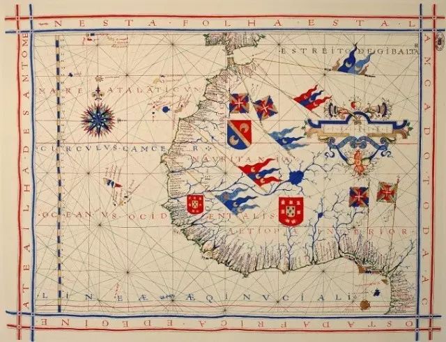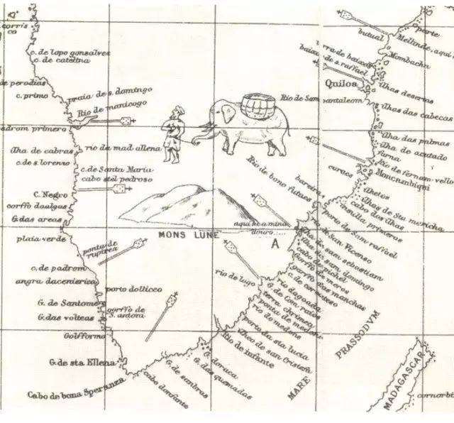 从图上可以看出,沿着左下方非洲大陆西海岸,有一条通畅的水道,由此一直南下将会抵达通往印度洋的入口。这样一条潜在的航道无疑对恩里克王子产生极大的诱惑。向南,向南,成了新崛起的葡萄牙海上帝国的进军口号。