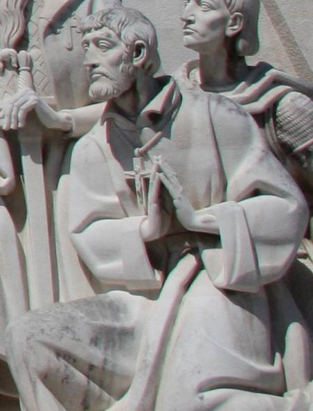 葡萄牙殖民者和后来的海上列强,给自己向外扩张找到一个冠冕堂皇的借口,那就是为上帝传播福音。随着地理大发现浪潮的高涨,许多传教士远涉重洋前往异国他乡。纪念碑东侧的下面两位是天主教传教士:双手高擎十字架的是方济各会修士恩里克·苏亚雷斯(Henrique Soares, c. 1465-1532),在他身后左手上举作祈祷状的是道明会修士贡萨洛·德·卡瓦略(Gonçalo de Carvalho)。