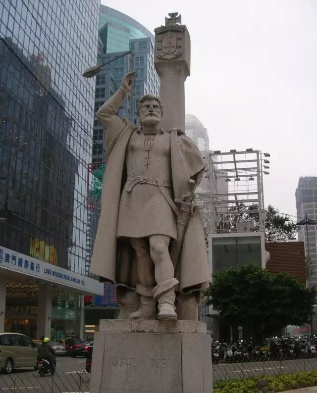 ►澳门南湾区华利前地街头的阿尔瓦雷斯纪念像,他身后是典型的padrão石柱,但在今日已无宣示主权的意义了。 图片来源:维基