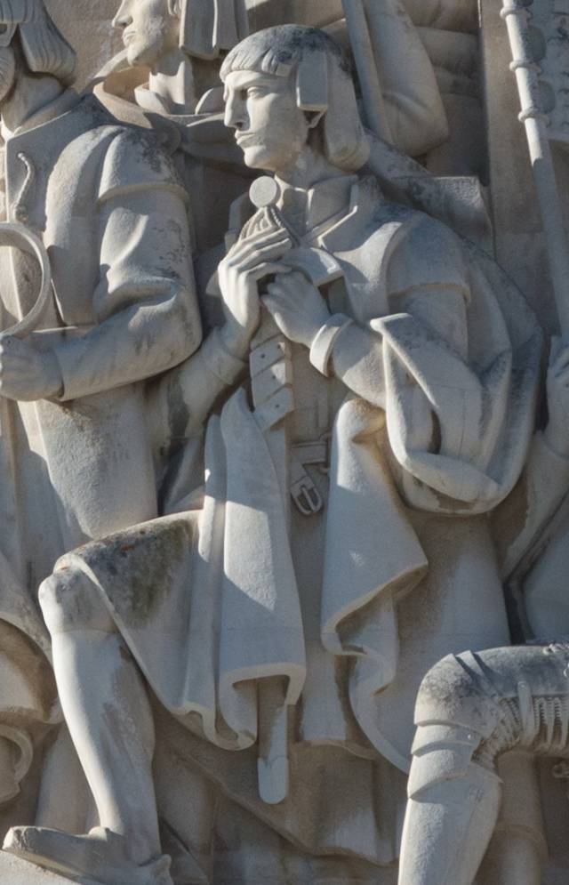 再后面一位与科学史大有关系,佩德罗·努内斯(Pedro Nunes, 1502-1578)是科英布拉(Coimbra)大学数学教授,多种航海理论与技艺书籍的作。他发明的星晷游标为第谷·布拉赫所采用,极大提高了天文观测的精度。不过他最重要的发明是1537年提出的“等角线”(loxodrome or rhumbline)航行法,其法与麦卡托投影地图相适配,按照与地理纬度成一定角度的方向航行,哥伦布就是依照此法去寻找印度的。雕塑中的努内斯左手捧着一个球状物,有人说是浑仪;笔者认为是地球仪,球面上可以清晰看到一条等角航线,他右手拿的也不是普通圆规,而是专门量度地球仪的球规。