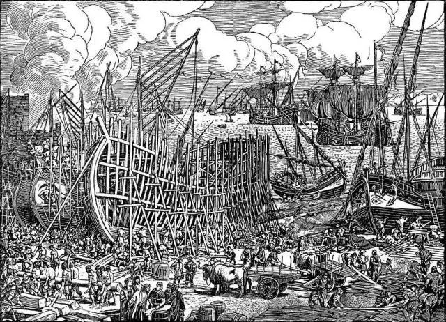 ►16世纪初里斯本船坞正在建造的一艘克拉克,紧挨着它有两艘卡拉维尔 图片来源:http://restosdecoleccao.blogspot.com/2014/10/arsenal-da-marinha.html