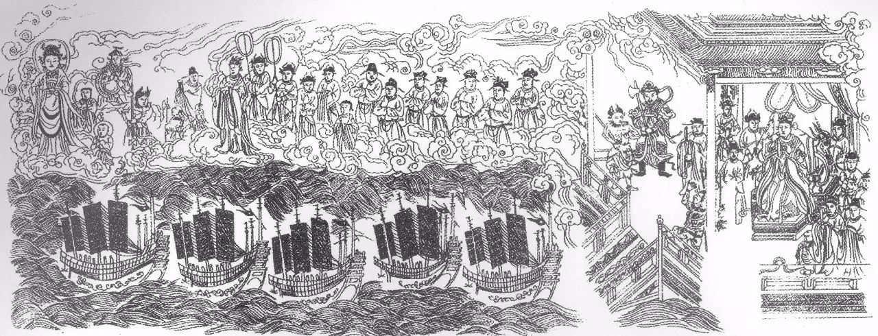下面是依照《中国美术全集》临摹复原的线图,原为六开相连的长幅,画面右端是端坐在宫中的天妃,左端站立者是观音菩萨,她们中间则有很多侍女、道童以及文武官员。画面下方可以看见五艘海船,在波涛汹涌的洋面上破浪前行。专家推测此图中的船,“艏艉高翘,船舷高,吃水深,正符合福船的特征……此图可作为宝船系福船型这一结论的有力证据。画中,那开阔海面上,成列、成行的船队,也为我们描绘了郑和下西洋气势磅礴的景象。”