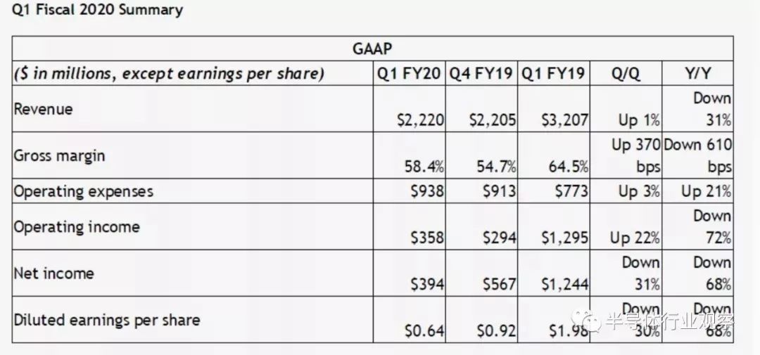 NVIDIA今天发布了2020财年第一季度财报。截止2019年4月28日,NVIDIA季度收入22.20亿美元(GAAP下同),环比增长1%,同比下跌31%;毛利率58.4%,环比提高3.7个百分点,同比减少6.1个百分点;净利润3.94亿美元,环比下跌31%,同比下跌68%。