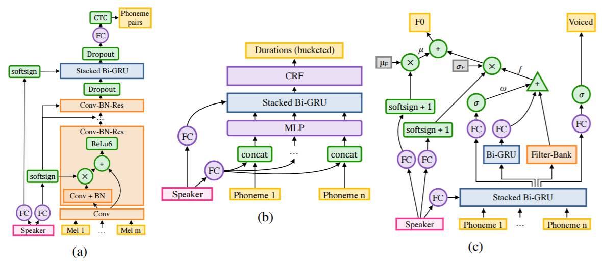 图 2:用于多说话人的架构。(a) 分割模型 (b) 持续时间模型 (c) 频率模型