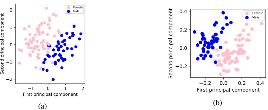 图 4:学习到的说话人嵌入的主成分,这是在 VCTK 数据集上学习到,分别来自 (a) 80 层的声音模型(vocal model)和 (b) 字符到频谱模型。详见附录 C.3。