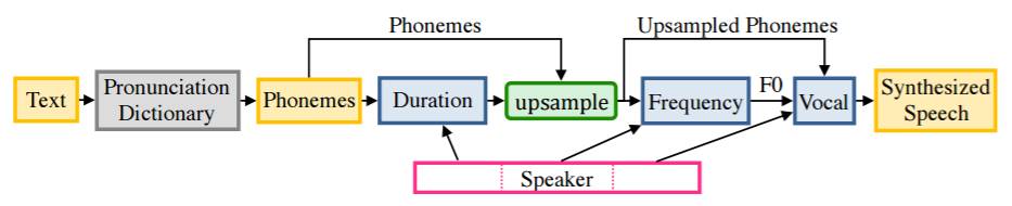 图 1:推理系统框图:首先是文本-音素词典转换,其次是预测音素持续时间,第三是上采样和生成 F0,最后将 F0 和音素馈送到声音模型(vocal model)