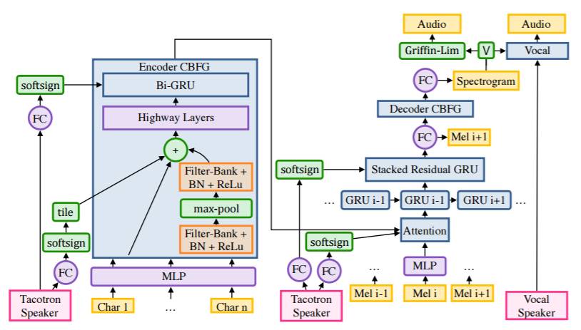 图 3:Tacotron,在 Encoder CBHG 模块中带有说话人调节(speaker conditioning),还有带有两种将频谱转换成音频的方法:Griffin-Lim 或我们的调节过说话人的 Vocal 模型