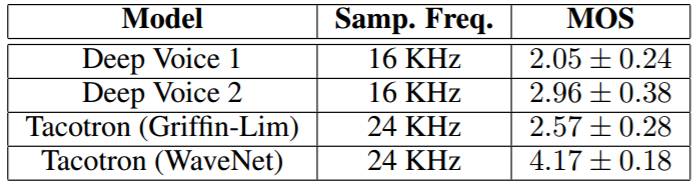 表 1:Deep Voice 1、Deep Voice 2 和 Tacotron 的平均意见分数(MOS)评估,使用了 95% 的置信区间。使用了 crowdMOS 工具包,来自这些模型的批量样本在 Mechanical Turk 上被呈现给评估者。因为这些批量样本包含来自所有模型的样本,所以该实验是这些模型之间的自然比较。