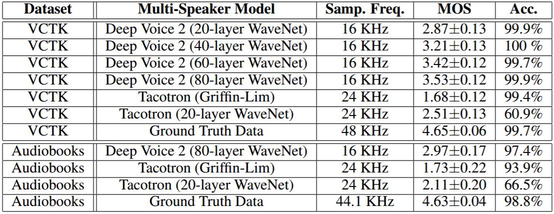 表 2:所有多说话人模型之间的 MOS 和分类准确度比较。为了得到 MOS,我们使用了 crowdMOS 工具包,细节如表 1 所示。我们还给出了在样本上的说话人鉴别模型(详情参见附录 D)的分类准确度,表明其合成的声音的区分度和真实音频一样。