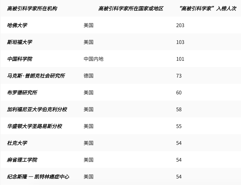 哈佛是全球高被引科学家人数最多的机构,中科院领跑内地