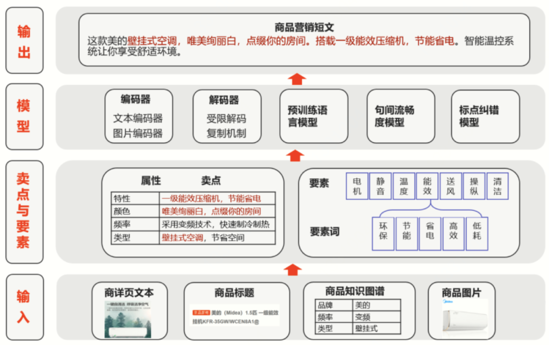 通过输入多模态(图片 + 文本)、异构(结构化商品知识图片和非结构化纯文本)数据,挖掘卖点和商品要素,模型包括多模态的编码器和解码器、预训练语言模型提高文本合规性、句间流畅度模型提高文本逻辑性、标点纠错模型改正标点错误,最终输出商品的营销短文。