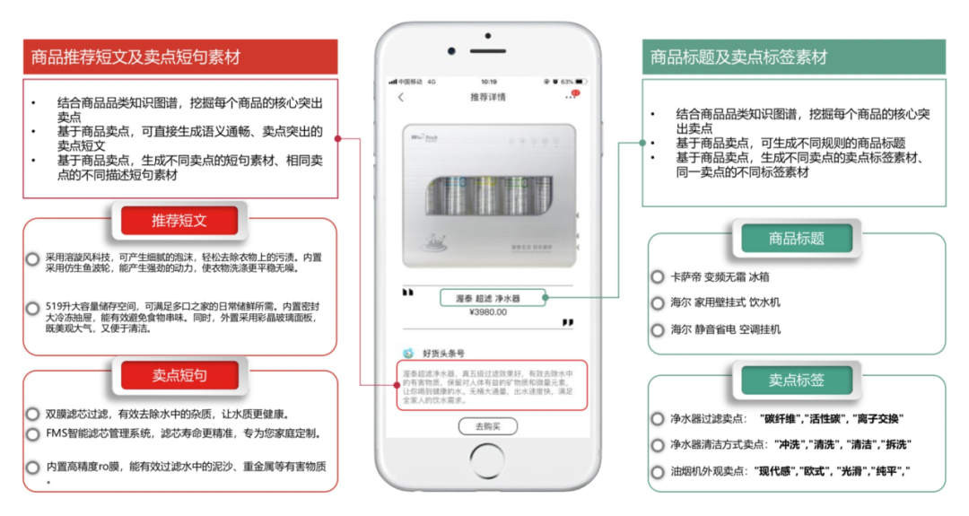 所以智能写作在电商场景中的应用是非常占优势的。同时也解决了品牌方、消费者和内容生产方三方的难题:品牌方所投放内容转化订单金额提升困难、消费者面对导购内容与商品不一致的平台使得选择成本增高,体验变差、内容生产方人工成本居高不下,资料搜集时间长,内容审核修订,素材产出效率低。
