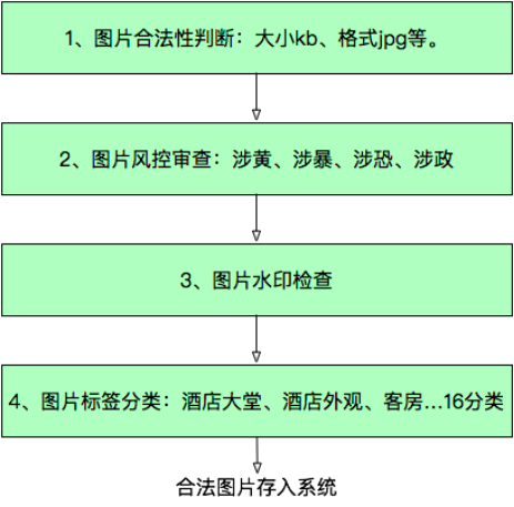 其中,第2、3、4步涉及到多个图片分类器,每个分类器的目标不同,所需要的训练数据也不同。对于输入的同一个样本图片,每个分类器完成自己的职能,目标单一可控。对于一些不通过的样本,可能还涉及到人工干预。最后合法的图片存入系统。