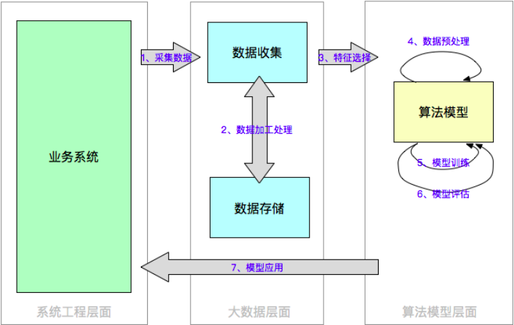 总结一下,经过数据采集、加工处理、特征选择、数据预处理、模型训练、模型评估、模型应用几个环节,数据跨过业务系统、数据平台、算法模型三个系统,形成一个闭环,最终又应用到业务系统中,这就构成了整个AI架构的核心。
