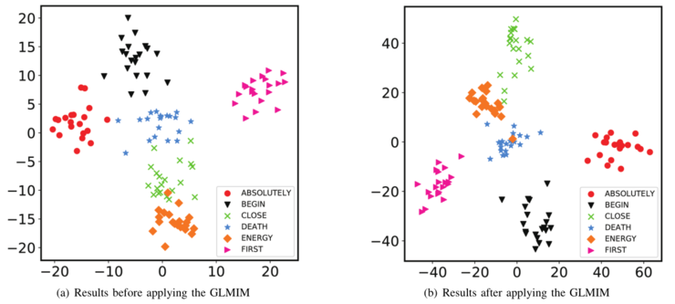 同时,研究团队利用可视化对 GMIM 的效果进行了进一步探究。如下图所示,下列这些词之间的差异范围从 -20 至 20 扩大到 -40 至 60 之间——这意味着随着 GMIM 的引入,区分词汇变得更容易。