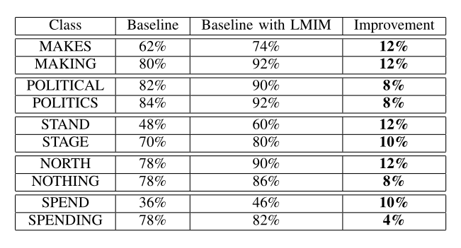 此外,通过引入 LMIM,模型对发音相似的词汇的识别的确显示出了更高的准确性和明显的改进,例如 Makes/making 和 Political/politics(如下图)。