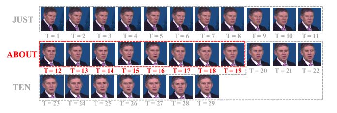 第一,即使在同一视频中存在其他单词,每个输入视频都用单个词标签来注释。例如下图中包括总共 29 个帧的视频样本被注释为“ABOUT”,但是“ABOUT”一词的实际帧仅包括在时间步 T=12∼19 处的帧,即红框中的部分,而红框前后的帧对应的词汇分别为“JUST”和“TEN”。