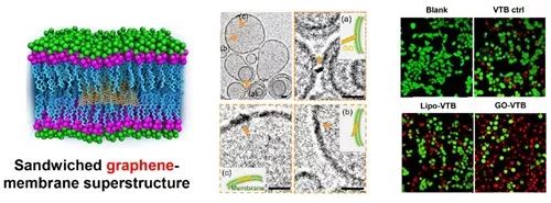 石墨烯-生物膜“三明治”超级结构及其在药物递送中的潜在应用。(左)模拟图;(中)冷冻透射照片;(右)膜间递送药物(GO-VTB)的优势结果