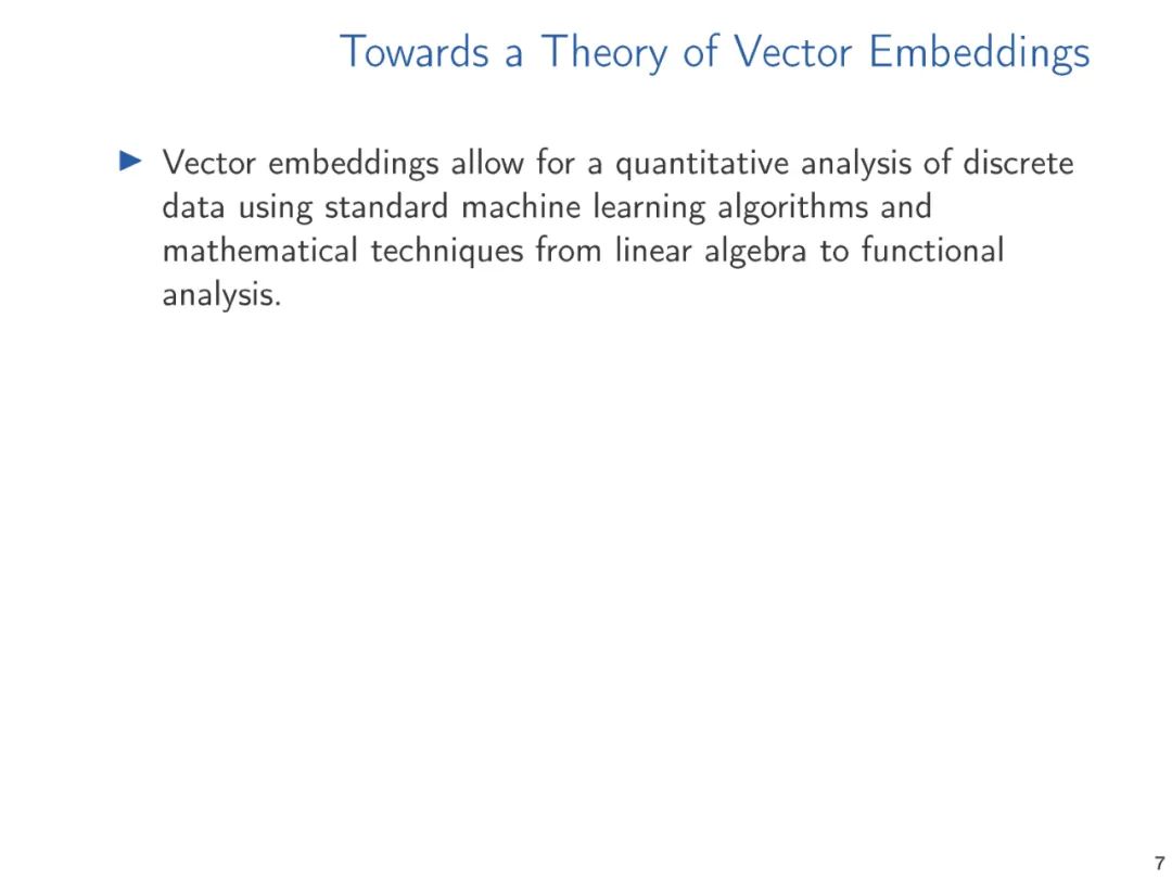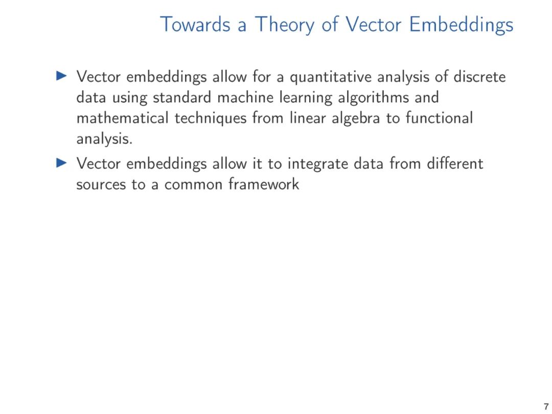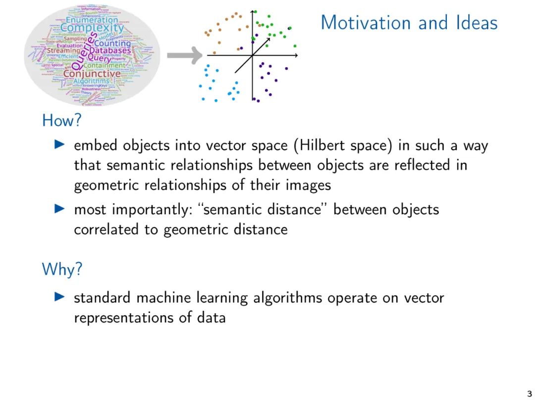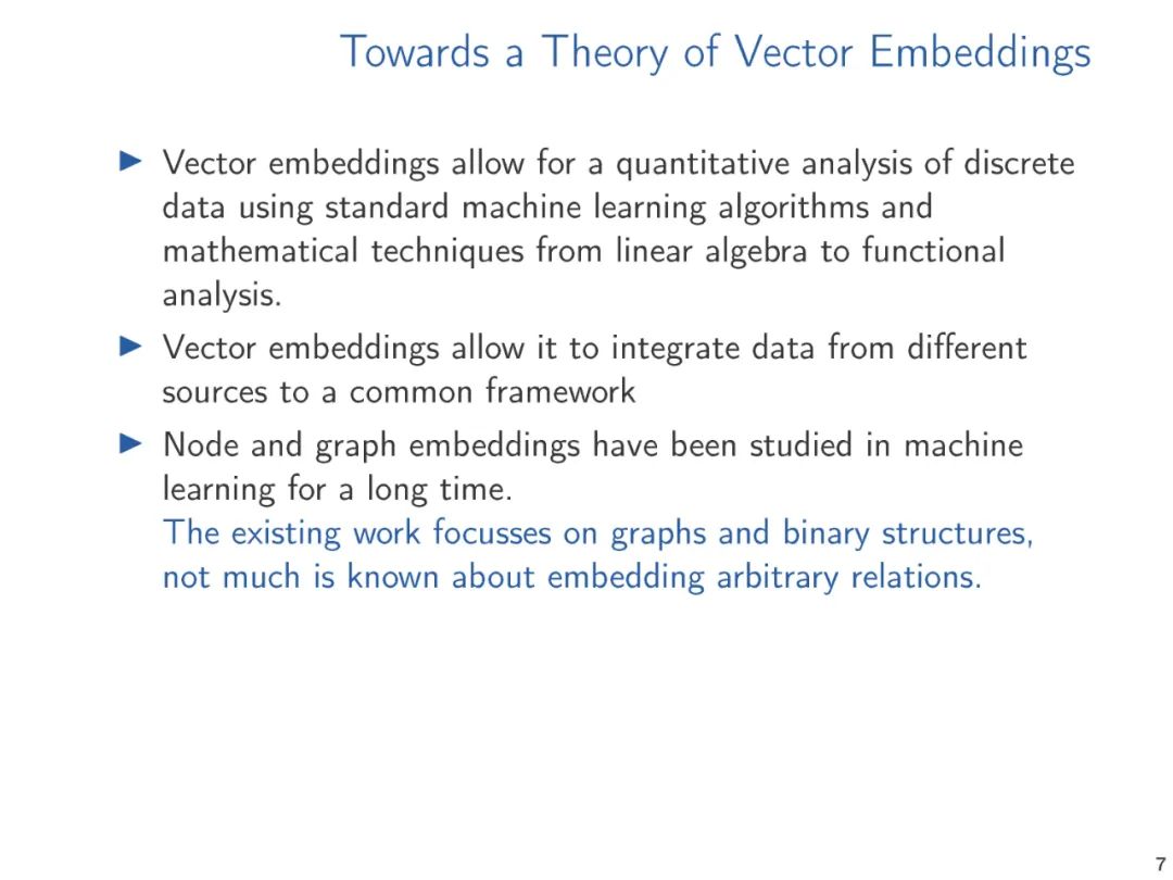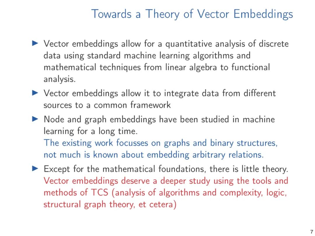 图和关系结构的向量表示,无论是手工制作的特征向量还是学习的表示,使我们能够将标准的数据分析和机器学习技术应用到结构中。在机器学习和知识表示文献中,广泛研究了产生这种嵌入的方法。然而,从理论的角度来看,向量嵌入得到的关注相对较少。从对已经在实践中使用的嵌入技术的调研开始,在这次演讲中,我们提出了两种理论方法,我们认为它们是理解向量嵌入基础的中心。我们将各种方法联系起来,并提出未来研究的方向。