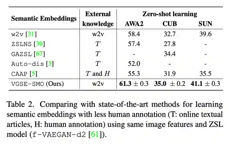 Table 1 展示了本文提出的类别嵌入 VGSE-SMO 与类别的 w2v 向量在三个数据集上的表现。为测试两种类别嵌入的能力,我们 f-VAEGAN-D2[5]等五种零样本分类模型上进行实验,结果表明本文提出的类别嵌入能够大幅度超越 w2v 向量的性能。
