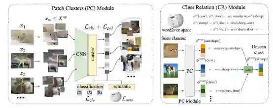 为了充分挖掘不同类别之间共享的视觉特征,VGSE 模型将大量局部图像切片按其视觉相似度聚类形成属性簇,从图像底层特征中归纳不同类别实例所共享的视觉特征。此外 VGSE 模型提出类别关系模块,在少量外部知识源的辅助下学习类别关系,能够将知识从源类别转移到目标类别,为没有训练图像的目标类别预测其类别嵌入。