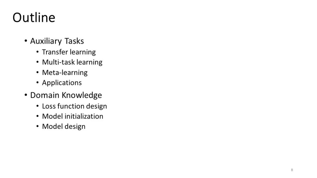 在大数据时代,数据驱动的方法在图像识别、交通信号控制、假新闻检测等各种应用中越来越受欢迎。这些数据驱动方法的优越性能依赖于大规模的标记训练数据,而实际应用中可能无法获得这些数据,即“小(标记)数据”挑战。例如,预测一个城市的突发事件,发现新出现的假新闻,以及预测罕见疾病的病情发展。在大多数情况下,人们最关心的是这些小数据案例,因此提高带有小标记数据的机器学习算法的学习效率一直是一个热门的研究课题。在本教程中,我们将回顾使用小数据进行学习的最新的机器学习技术。这些技术被组织从两个方面: (1) 提供一个全面的回顾最近的研究关于知识的泛化,迁移,和共享,其中迁移学习,多任务学习,元学习被讨论。特别是元学习,提高了模型的泛化能力,近年来已被证明是一种有效的方法; (2) 引入前沿技术,着重于将领域知识融入机器学习模型中。与基于模型的知识迁移技术不同,在现实应用中,领域知识(如物理定律)为我们提供了一个处理小数据挑战的新角度。具体地说,领域知识可以用来优化学习策略和/或指导模型设计。在数据挖掘领域,我们认为小数据学习是一个具有重要社会影响的热门话题,将吸引学术界和产业界的研究者和从业者。