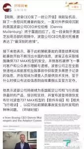 波音公司CEO米伦伯格表示波音正在采取措施确保737 MAX机型的安全,并就客机被停飞一事对客户和公众表示理解与遗憾。波音公司正在全面快速地从埃航客机坠毁事故中获取更多黑匣子记录的信息,并在现场为调查人员提供技术支持。他表示波音公司将很快发布针对波音737 MAX机型的“软件升级”和“相关飞行培训”。