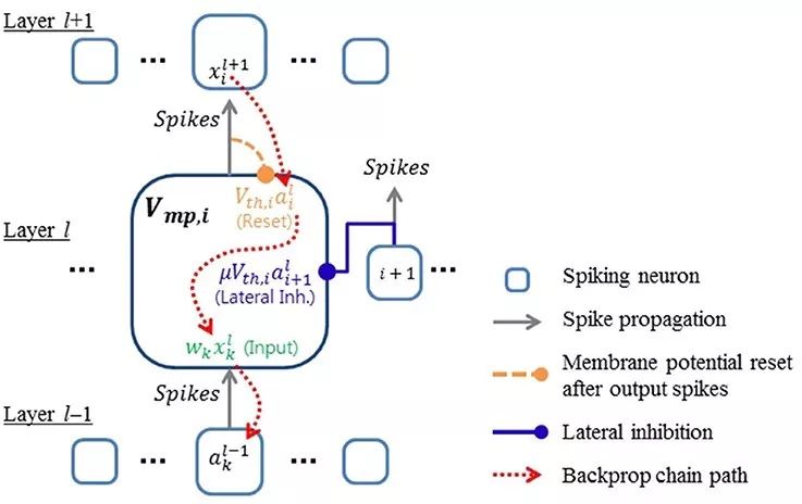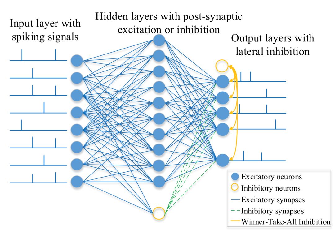 前面提到过SNN的网络结构与ANN类似,但是它们之间也有不同之处,这个不同就是源于生物神经网络中神经元的侧向抑制作用。所谓侧向抑制,就是指处于同一层中的不同神经元之间的相互作用。当一个神经元接受刺激被激活以后,它除了将刺激传递到下一层神经元,还会因为本身被激活而抑制其同一层内周边神经元被激活的概率。从神经元模型中体现的就是膜电位高于静息电位(-65mV或者是其他预设值)的神经元会抑制其周围甚至同层内所有神经元的膜电位增长。这种侧向抑制作用使得受到刺激较多的神经元比其他神经元有更大概率产生脉冲信号输出,从ANN的角度来看,这有点类似于Attention机制,但是又比Attention机制更加强烈和粗暴。