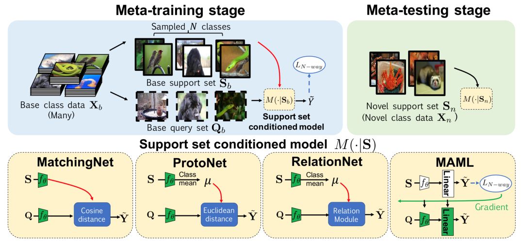 考虑到人可以通过很少的几个标签样本学习到一个类别的特征,那么神经网络也应该拥有这样的能力。与人类相比,现在的神经网络的不同点主要有两点。一是人类具有很多先验知识,即使是刚出生的婴儿也知道美丑。二是人类在学习的过程中很多情况下不光是学到一个概念,而是在加强自己学习的能力,这是传统神经网络所不具有的能力。针对这两点不同,一些研究者使用元学习方法解决小样本学习问题,这次主要讨论一下小样本分类问题。