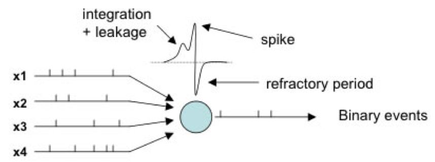 顾名思义,脉冲神经网络(SNN)最大的特点就是用到了脉冲信号,SNN与ANN最主要的不同就是使用离散的脉冲信号替代ANN网络中传播的连续的模拟信号。SNN的网络结构与ANN类似,主要使用类似于全连接网络或者CNN结构的网络。为了在这种网络结构上产生脉冲信号,SNN使用了更加复杂也更加贴近于生物的神经元模型,目前使用最多的是Integrity-Fire(IF)模型和Leaky integrity-Fire(LIF)模型。对于这类神经元模型来说,输入信号直接影响的是神经元的状态(膜电位),只有当膜电位上升到阈值电位时,才会产生输出脉冲信号。