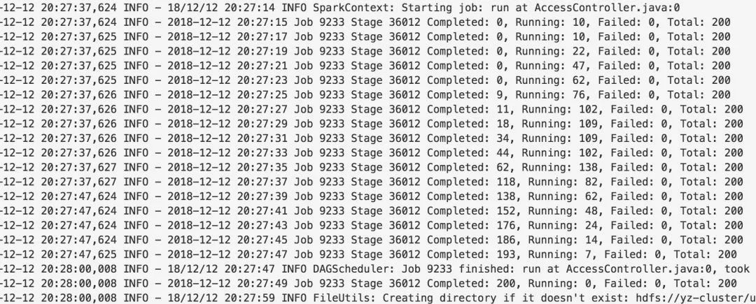 我们碰到的第一个问题是用户向我们抱怨通过 JDBC 的方式和 Spark thrift server(STS) 交互,执行一个 SQL 时,没有执行的进度信息,需要一直等待执行成功,或者任务出错时接收任务报错邮件得知执行完。于是执行进度让用户可感知是一个必要的功能。我们做了 Spark 的改造,增加运行时的 operation 日志,并且向社区提交了 patch(spark-22496), 而在我们内部,更增加了执行进度日志,每隔 2 秒打印出当前执行的 job/stage 的进度,如下图所示。