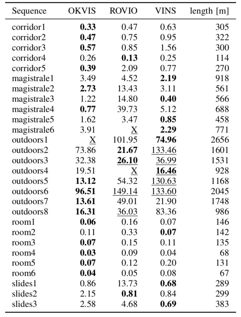 评估过程说明即便是当前最优的算法在长序列(magistrale,outdoors)和有视觉挑战性的序列(slides)上会有较大的漂移。这充分说明了该数据集足够有挑战性,可以作为未来视觉惯性里程计算法研究的基准。