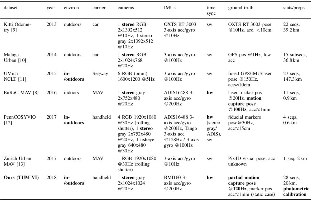 一些近期的数据集与TUM VI数据集类似,也是面向评估视觉惯性里程计和SLAM方法,经过同步的视觉数据与IMU测量值。EuRoC MAV数据集包含11个室内数据序列,由一个无人飞行器上的双目视觉惯性传感器Skybotix采集得到。准确的姿态真值(误差大约1毫米)由一个激光跟踪器或运动捕捉系统记录得到。与本文基准相比,EuRoC数据集中的序列时间上更短,并且差异性不够大,因为它只包括了一个机器厂房和一个实验室环境。但是EuRoC数据集不包括对评估直接法至关重要的光度标定。针对视觉惯性SLAM的还有PennCOSYVIO数据集和Zurich Urban MAV数据集,然而它们也没有像TUM VI一样包含光度标定,准确姿态真值或者IMU和相机之间的时间同步。