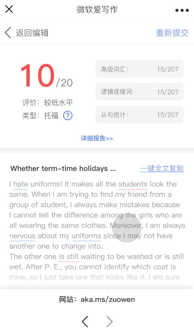语法检查是作文批改中最基本的核心功能。在日常学习中,不少学生经常面对艰深的语法难题堕云雾中。对此,“爱写作”在快速完成全文语法检查的同时,会将提交作文中的语法问题用红色下划线标记出来。学生只需点击红线,就能获得有针对性的语法讲解,并且还可以看到修改后的正确表达,作为参考,让学生们不仅知错就改,而且知道如何去改。