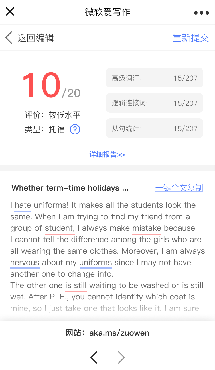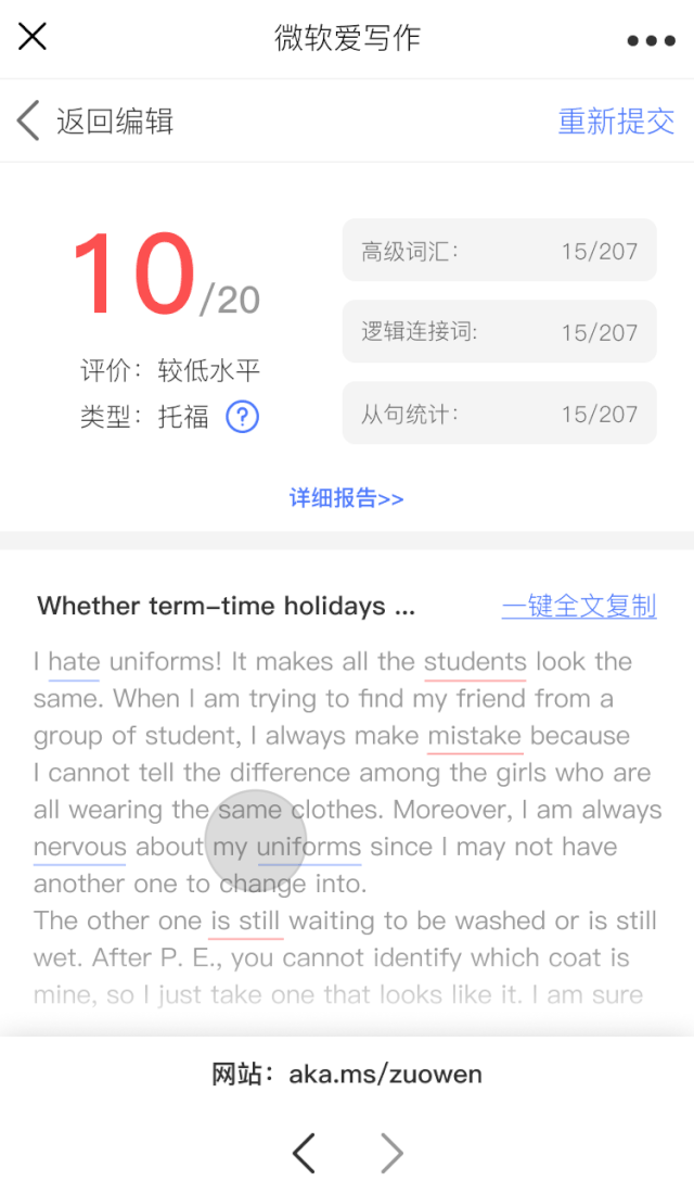 作文打分是很多学生都十分关心的环节,分数固然重要,但分数背后的信息更重要。基于此前微软小英“作文打分”功能和“爱写作”网页版积累的丰富经验,升级后的“爱写作”作文打分功能更加强大,不仅可以对所有文章进行一般性评分,还可以测试同一篇作文在不同考试类型中的得分状况。因为不同的考试在词汇、语法、文章结构、连贯性、切题程度等维度上对作文有不同的考量标准,所以“爱写作”在给出分数的同时,还可以有针对性地评价一篇作文在上述这些维度上的表现,并给出反馈建议,以便学生更好地进行自我提升。目前,“爱写作”支持小学、中考、高考、四级、六级、考研、托福、雅思共八大英语考试类型。