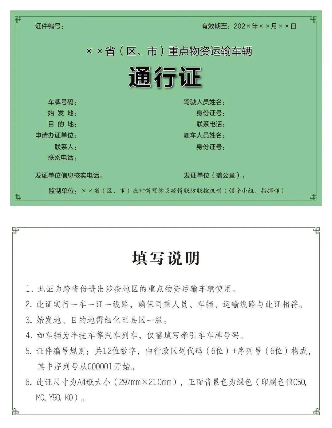按照国务院联防联控机制有关工作部署,交通管控与运输保障专班印发通知,公布了《重点物资运输车辆通行证》式样,推动建立统一规范的通行证制度,保障涉疫地区重点物资运输。通行证实行“一车一证一线路”,有效期由各省级联防联控机制确定,纸质和电子通行证具有同等效力。(中青报)