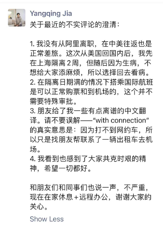 近日,阿里技术副总裁贾扬清被传因疫情深夜逃出上海去美国。14日,贾扬清回应称,没有离职,在中美往返是正常差旅,因身体原因前往美国看病,请大家不要误解。(鞭牛士)
