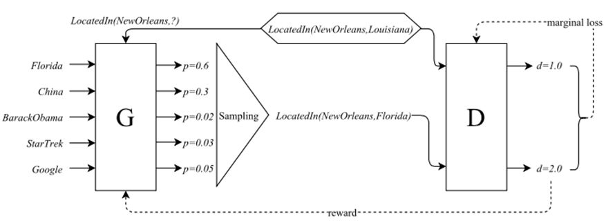 最后通过模型图我们发现论文使用softmax概率模型为生成器G,通过概率分布进行采样;判别器部分D接收生成的负样本和ground truth triple并计算分数;G通过梯度策略最小化生成的负三元组的分数,D通过梯度下降最小化正样本和负样本的边缘损失。